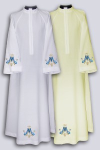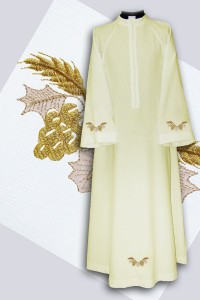 Les aubes sacerdotales aux décorations complexes donneront un résultat exceptionnel lors de la célébration de la liturgie. Ces habits haut de gamme sont ornés sur les manches, à l’avant et à l’arrière par une broderie ajourée et délicate. L'élément décoratif peut être l'ornement d’une croix, d’un signe de l’Eucharistie, d’un épi et du vin ou d’une vigne, d’un épi et du poisson. Les aubes présentées ont des manches raglan, qui se caractérisent par des coutures diagonales visibles allant du décolleté jusqu’à la ligne des aisselles et qui sont fermées avec un zip, que nous cousons devant ou sur le bras. Elles sont toutes fabriquées en gabardine ou coton-viscose. Couleur blanche ou crème au choix.