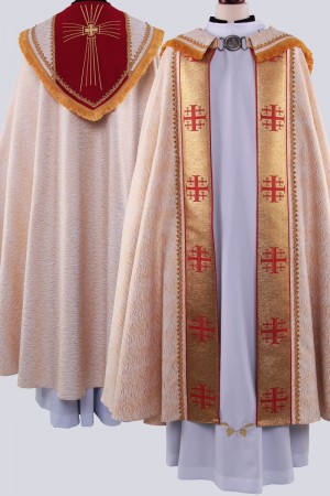 Une cape est une sorte de longue pèlerine portée par le prêtre. La cape est utilisée lors des célébrations, processions, liturgie des heures, au moment du baptême. En dehors de la messe sainte elle signifie le service royal et la grande dignité du devoir sacerdotal. Nos capes sont fabriquées selon la tendance actuelle de créer des vêtements liturgiques, sur lesquels les riches ornements ne sont pas préférables, mais plutôt des capes simples en matériaux légers.
