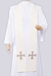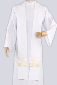 E-liturgia produit de nombreux vêtements liturgique, qui peuvent être portés à toutes les périodes liturgiques. La chasuble blanc est utilisée pendant les messes de Pâques et de Noël, pendant les fêtes et les souvenirs du Jésus-Christ ou les fêtes de la Toussaint. Les chasubles solennelles que nous produisons se distinguent non seulement par les bandes décoratives aux motifs liturgiques, mais aussi par la haute qualité des tissus utilisés.