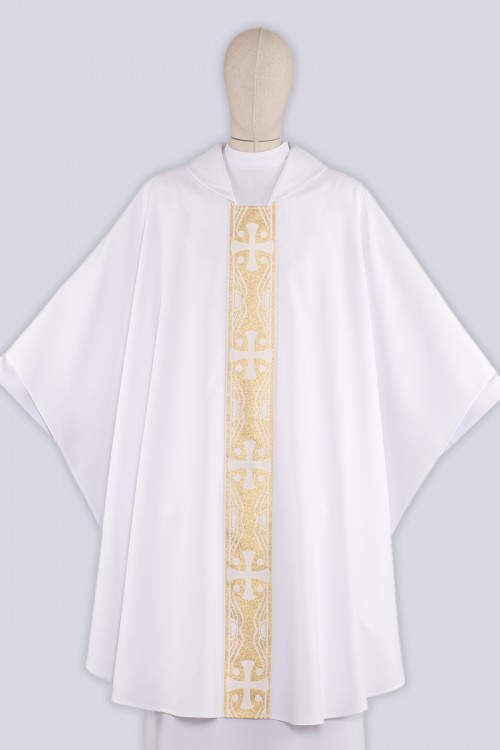 Belle chasuble solennelle ornée d’une bande décorative. Ornement en forme de motif liturgique de couleur blanche cousu à l’avant et à l’arrière de l’habit. Ce modèle est également disponible avec une étole.