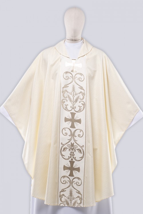 Belle chasuble solennelle ornée d’une bande décorative. Ornement en forme de motif liturgique de couleur or-blanche cousu à l’avant et à l’arrière de l’habit. Ce modèle est également disponible avec une étole.