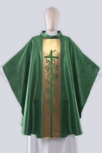 Les chasubles produites par E-liturgia se caractérisent par la durabilité et la commodité d’utilisation exceptionnelle. Notre atelier, soucieux du moindre détail, fabrique les chasubles avec ornements sous forme de bande décorative, sur laquelle se trouve les symboles de la croix, d’une vigne et d’un épi. Les chasubles vertes avec ornements sont portées pendant les périodes normales de l’année – per annum.
