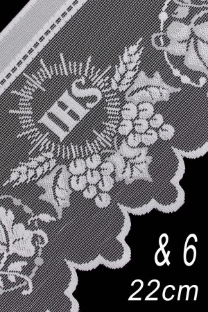 Les produits que nous proposons sont fabriqués en Pologne et les motifs exclusifs créés dans notre atelier sont soumis au droit d'auteur. Notre objectif était de créer des motifs uniques avec de beaux symboles liturgiques qui deviendraient un bel ornement d'un surplis, d'une aube ou d'une nappe. Nous offrons la dentelle d'une hauteur de 22 cm. La longueur maximale que nous pouvons proposer est de 15 mètres.