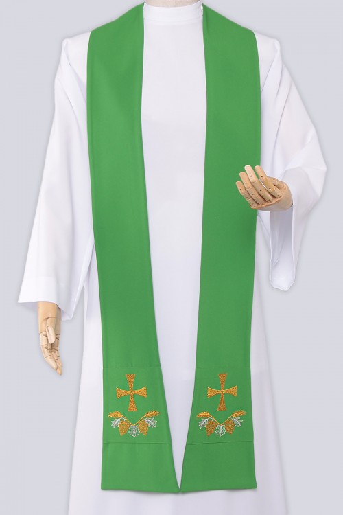 Dans le service sacerdotal, l’étole qui fait partie de la collection des étoles vertes est mise en dessous d’une chasuble, sur le surplis ou sur l’aube. L’étole présentée se distingue par un ornement élégant aux motifs liturgiques utilisés à l’église catholique romaine. L’étole sera parfaitement adaptée lors du service sacerdotal pendant le temps liturgique normal. L’étole sera un choix parfait lors du service sacerdotal en temps liturgique normal.