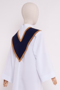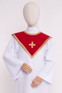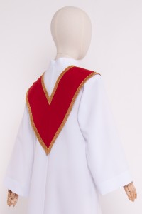 Les cols à mettre séparément seront une décoration parfaite pour les aubes pour chœurs d’églises. Nous proposons deux coupes en forme de triangle et d’écharpe. Les cols triangulaires sont ornés d’un ruban brocart épais et sont proposées en plusieurs versions de couleurs. Les cols-écharpes sont cousues des deux côtés en tissu brocart doré et en gabardine de couleur contrastée. Les cols en forme de triangles sont cousus en deux versions: avec la croix décorative ou sans croix.