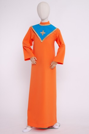 Les membres d’un groupe de musique ou d’une chorale religieuse s’intéressent à choisir un habit, qui pendant les cérémonies religieuses va les mettre en valeur. Nos produits ont été conçus en pensant à ces besoins. L’habit présenté se compose de deux parties - une aube légère et confortable avec des manches longues et un col chic. L’ensemble d’habits pour chorale T2/pom-laz se compose d’une aube orange et d’un col orné d’un ruban doré et d’une croix. Le tissu utilisé pour la fabrication se distingue par sa légèreté, l’ son aération et son confort.