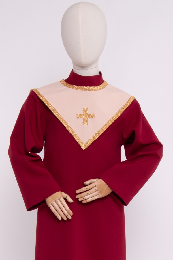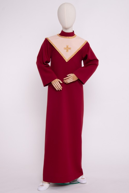 Les membres d’un groupe de musique ou d’une chorale religieuse s’intéressent à choisir un habit, qui pendant les cérémonies religieuses va les mettre en valeur. Nos produits ont été conçus en pensant à ces besoins. L’habit présenté se compose de deux parties - une aube légère et confortable avec des manches longues et un col chic. L’ensemble d’habits pour chorale T2/wis-brz se compose d’une aube cerise et d’un col orné d’un ruban doré et d’une croix. Le tissu utilisé pour la fabrication se distingue par sa légèreté, l’ son aération et son confort.