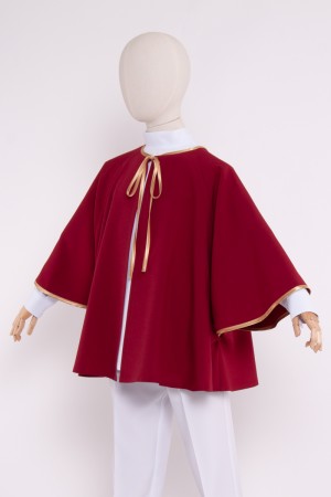 Pèlerine cerise originale avec manches qui vont derrière les coudes, est consacrée aux choeurs et autres formations. C’est une idée d’habit de choeurs destinée aux enfants pour commencer, ensuite aux adolescents et pour finir, aux adultes. Par son style elle est dédiée surtout aux filles et femmes, mais les hommes peuvent choisir les couleurs sombres telles que le noir et le bleu foncé pour contraster. La coupe est élargie à l’avant et à l’arrière et elle a des manches larges. Elle est ornée d’une bande de couleur dorée, qui sert non seulement à décorer mais aussi à nouer.