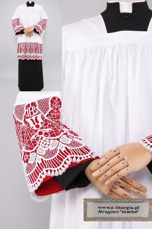 Le surplis prélat cousu en tissu naturel que constitue le coton avec ajout de viscose dédié aux prêtres. Cet habit unique est orné d’une guipure de hauteur de 30 cm, qui contraste avec la doublure rouge. Cette riche variété de dentelle est cousue sur les manches et en bas et doublée d’un tissu rouge.
