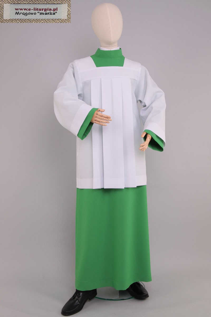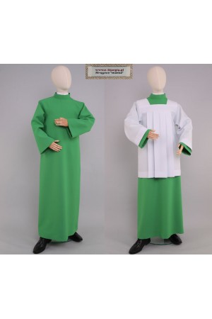 L’ensemble pour lecteurs et enfants de choeur est composé d’une aube et d’un surplis pour enfants de choeur cousus d’une coupe classique romaine à plis. L’habit dédié aux enfants de choeur et lecteurs se distingue par sa fabrication soignée et se compose de l’aube en coton-viscose léger et aéré ou en polyester résistant. L’aube vert est un habit parfaitement adapté au moment de l’Eucharistie et qui ajoute de la prestance aux devoirs exercés par les enfants de choeur et lecteurs. L’aube avec col montant d’une coupe simple est légèrement élargie en bas et a une fermeture derrière.
