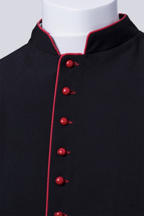 Soutane noire pour prélat sans doublure et raidissement conçue pour les pèlerinages et les journées chaudes. Frange rouge, boutons et trous. Poche intérieure sur le torse. Double poches (poche et accès à la poche du pantalon). Fermeture à boutons selon les modèles suivants :